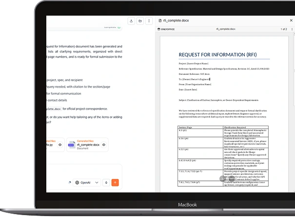 Automatically create RFIs, submittal sheets, revision logs, and compliance summaries — no manual formatting or admin work needed.