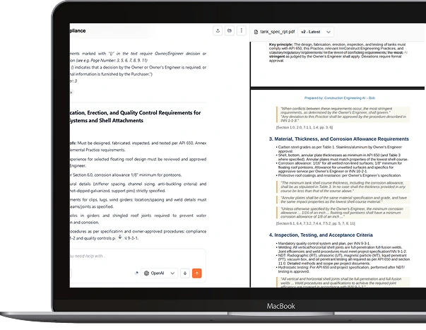 Quickly analyze specs, drawings, and standards. Extract material criteria, testing procedures, code references, BOQs, and more — all in one view.