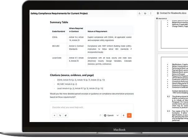 Built for contractors, not general use. Works with your documents, platforms, and formats — with source-linked answers and task-specific model switching for things like spec review or vendor evaluation.