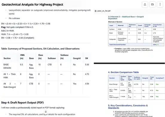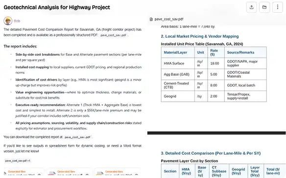 Don't let geotechnical data and pavement design stall your progress. Geotechnical Analysis Agent instantly analyzes borehole logs and soil data to generate optimized configurations using engineering logic and real-time pricing. It's a single, intelligent workflow for faster, smarter design decisions.